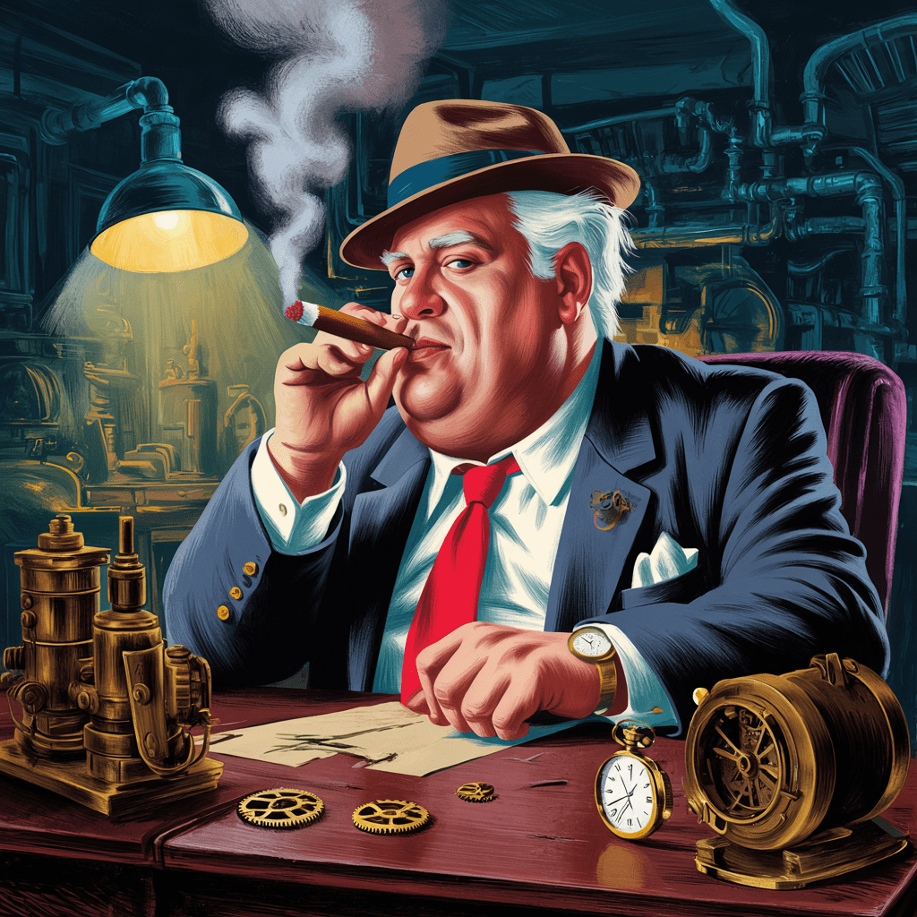 His hair was neatly combed, a vivid red tie at his chest, and his posture held authority.